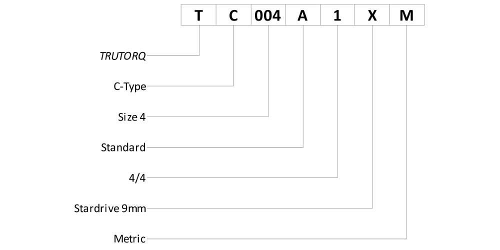 | T | Trutorq C‑Type | 002 C‑Type | A Standard 0 | DA C & E‑Type 002 | X=09 mm C‑Type | M Metric | VS Viton Seal |