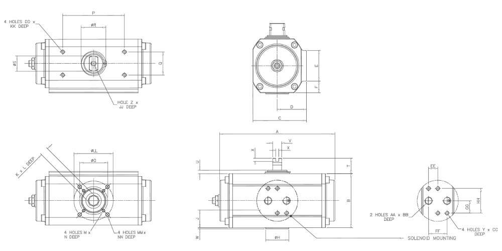 | Size (GAS) | ISO | A | B | C | D | E | ØG | ØH | J | K | L | M | N | P | Q | ØR | ØS | T | U | V | W | X | Y | Z | AA | BB | CC | DD | EE | FF | GG | HH | JJ | KK | Ø LL | MM | NN |